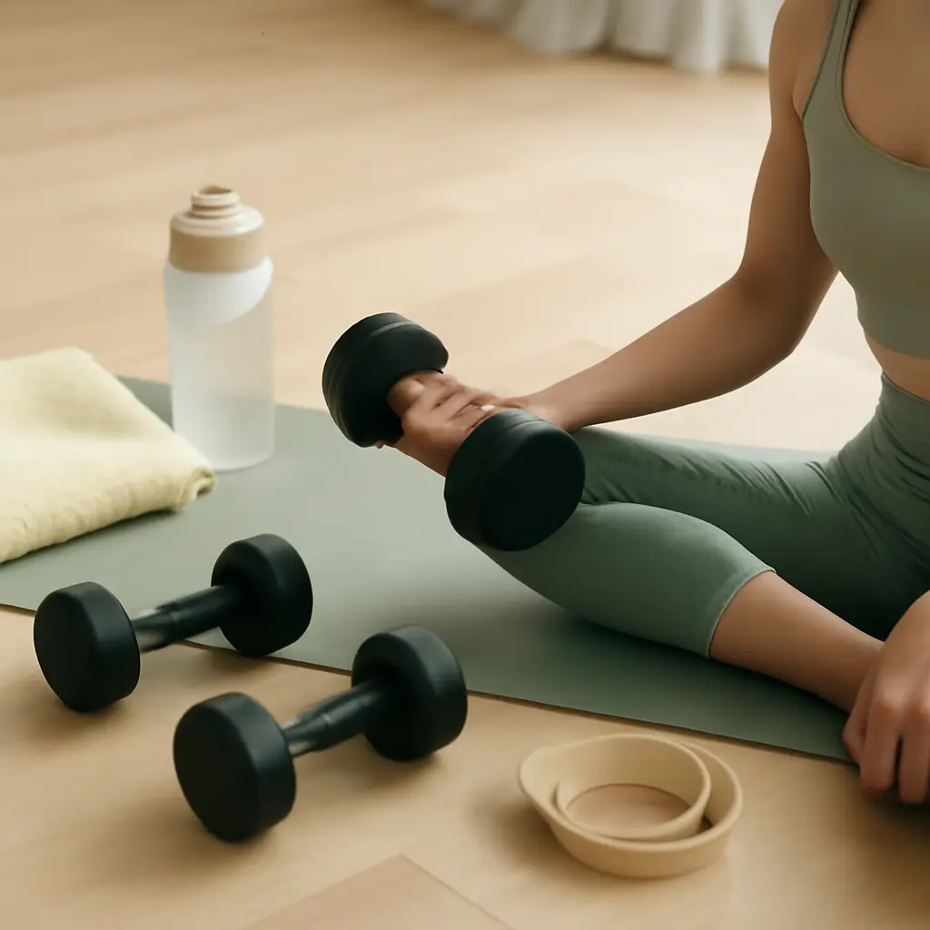 Fitness equipment including a water bottle, dumbbells, and a towel placed on a green yoga mat, with a supplement container and gym bag in the background, illustrating a healthy lifestyle focus on vitamins and wellness.