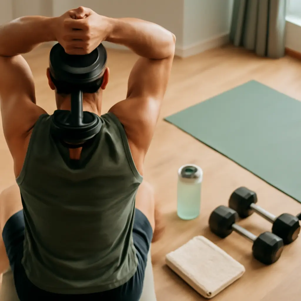- Hold a dumbbell in one hand, lifting your arm overhead, keeping the elbow close to your head.