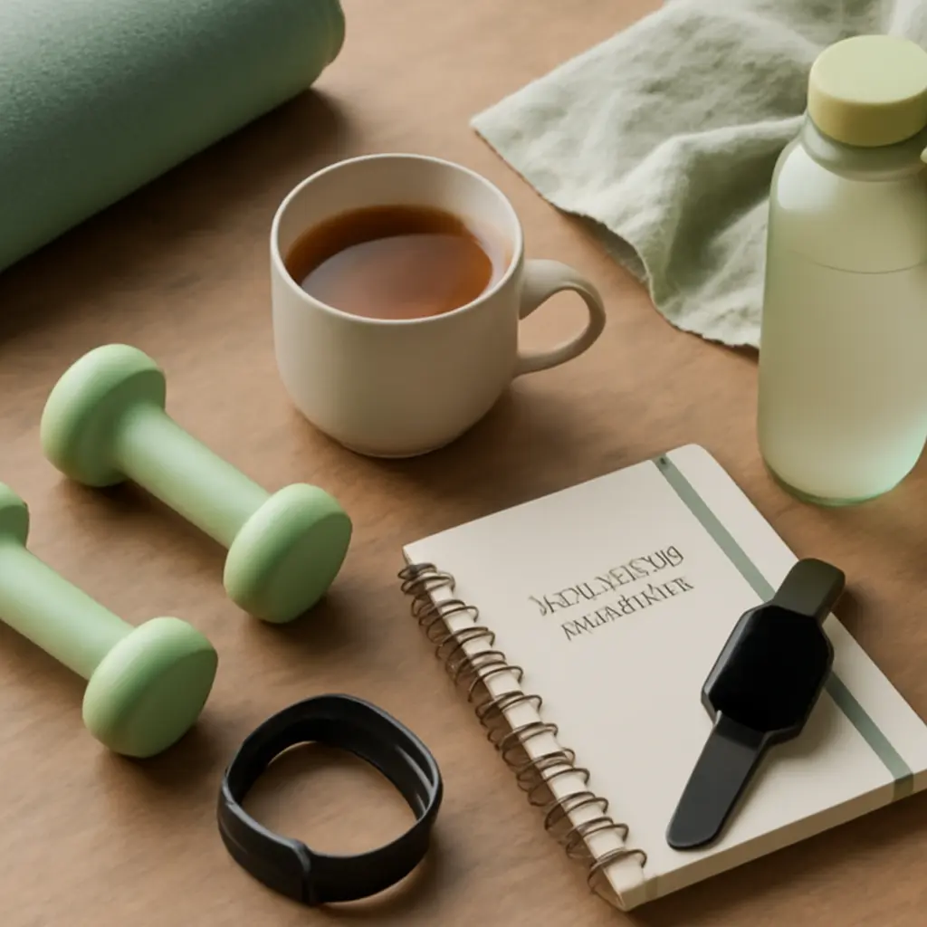 Flatlay of fitness and wellness items including a yoga mat, a cup of tea with lemon, white sneakers, a water bottle, a smartwatch, and a wellness journal, symbolizing healthy living and exercise.