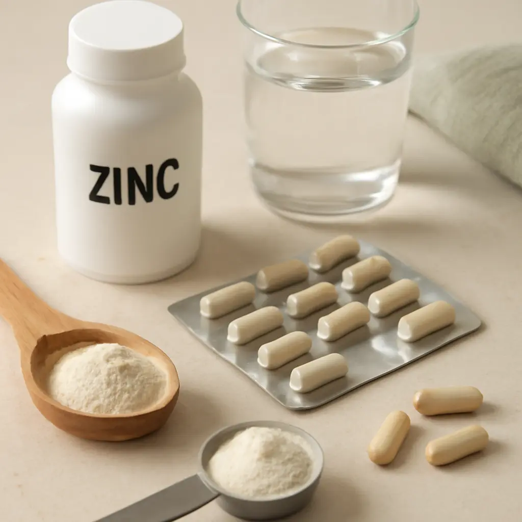 The recommended daily allowance (RDA) for zinc varies by age and gender, with adult women requiring 8 mg per day and men 11 mg per day. These values may increase in circumstances of heightened physiological demand, such as during illness, pregnancy, or intense physical activity.Zinc supplements are available in various forms, including zinc citrate, gluconate, and picolinate, which are known for their higher bioavailability. To maximize absorption, it is advisable to take zinc supplements on an empty stomach or at least two hours apart from meals or supplements containing high levels of phytates, calcium, iron, or copper.