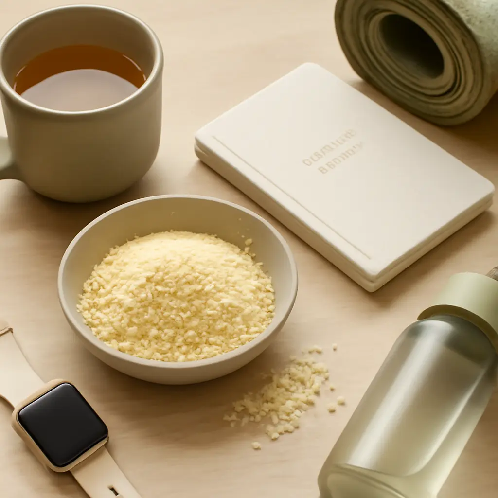 A collection of health and wellness items includes a bowl of protein powder, a glass of milk, soybeans in a bowl, a supplement bottle, and a fitness tracker, highlighting nutrition, supplements, and fitness essentials.