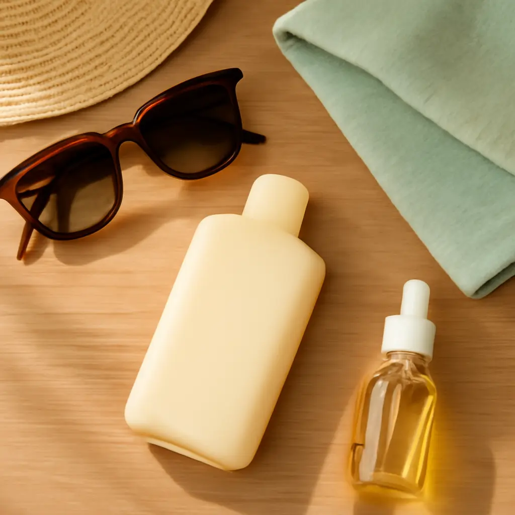 A sun hat, sunglasses, grapefruit half, tube of sunscreen, and a bowl of vitamin supplements on a wooden surface, symbolizing wellness and healthy living.
