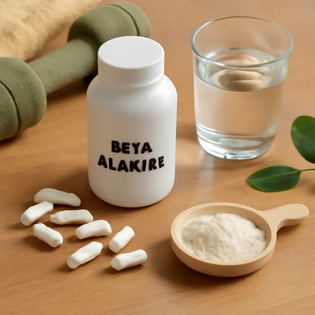 Beta-alanine supplement bottle with white capsules, a scoop of powder, and a glass of water, emphasizing fitness and wellness benefits.