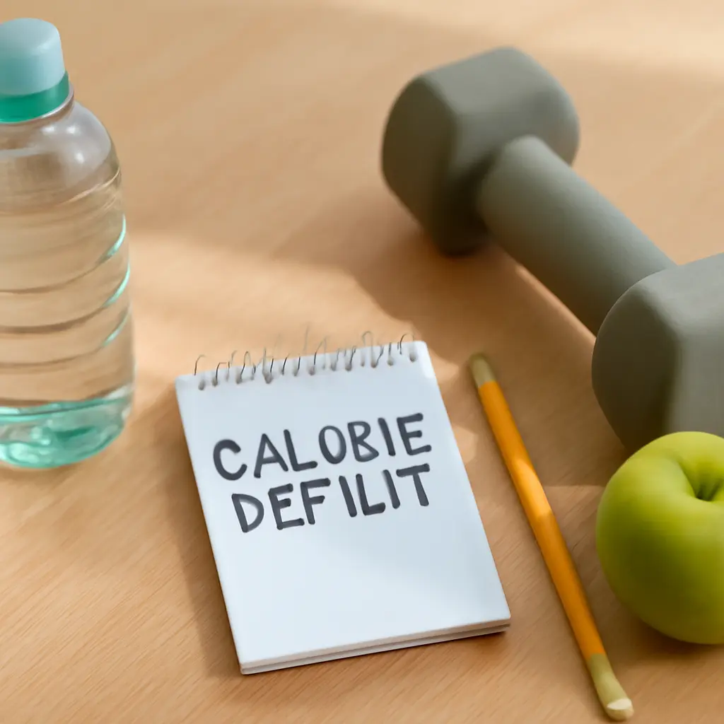 Notepad with 'Calorie Deficit' text, surrounded by a bowl of salad, oatmeal, a water bottle, and dumbbells, symbolizing fitness and healthy eating.