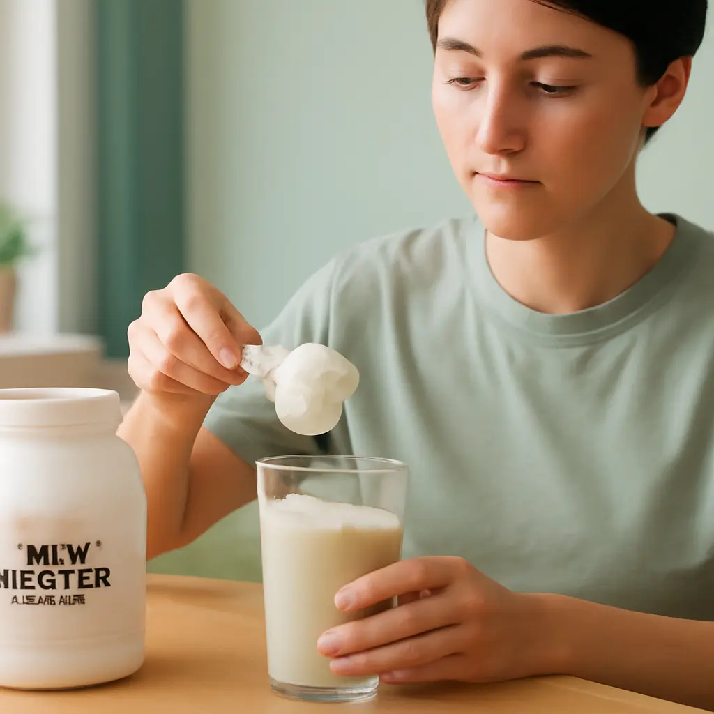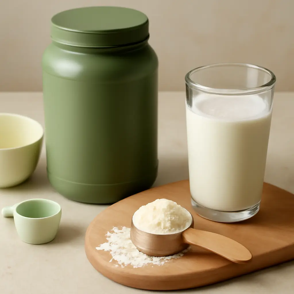 Whey protein jar, powder, and capsules with a glass of milk, emphasizing fitness and wellness supplements.